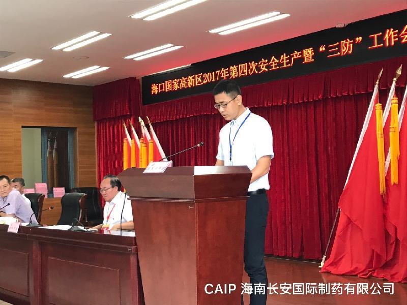 2017年10月20日,在海口國家高新區(qū)2017年第四次安全生產(chǎn)暨“三防”工作會議上,海南長安國際制藥有限公司等11家企業(yè)在第20號臺風(fēng)“卡努”期間,積極配合高新區(qū)管委會做好防風(fēng)防汛及臨時避險點的安置工作,獲得“優(yōu)秀企業(yè)”表彰,公司有幸代表受表彰的企業(yè)之一受邀上臺發(fā)言。