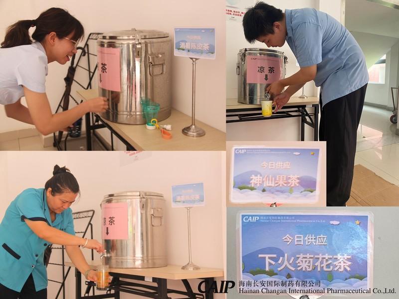 海南已經(jīng)進(jìn)入了炎炎夏日,長安制藥為了關(guān)愛員工,決定在6月到10月,每周一、 周五推出了自行配制的特色涼茶,有生津止渴的下火菊花茶,有用羅漢果熬制的神仙果茶,消暑陳皮茶,鴛鴦藤煮的金銀消暑露等,供員工們免費(fèi)飲用,把關(guān)懷、關(guān)愛送到眾多員工心中,給一直默默堅(jiān)守在工作崗位的員工們帶去獨(dú)特的清涼和消暑模式。