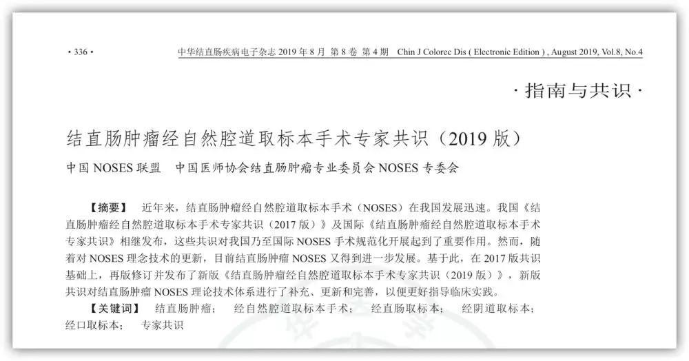近年來,結(jié)直腸腫瘤NOSES更新速度非常快,其理論技術(shù)體系也發(fā)生很大變化,2017年發(fā)布的《結(jié)直腸腫瘤經(jīng)自然腔道取標(biāo)本手術(shù)專家共識(shí)(2017 版)》中很多內(nèi)容也無法滿足目前NOSES手術(shù)的臨床需要。基于此,中國醫(yī)師協(xié)會(huì)結(jié)直腸腫瘤專業(yè)委員會(huì) NOSES 專委會(huì)及中國NOSES 聯(lián)盟的數(shù)十位專家,在 2017 版共識(shí)的基礎(chǔ)上,共同再版起草了《結(jié)直腸腫瘤經(jīng)自然腔道取標(biāo)本手術(shù)專家共識(shí)(2019 版)》(以下簡(jiǎn)稱《共識(shí)》)。